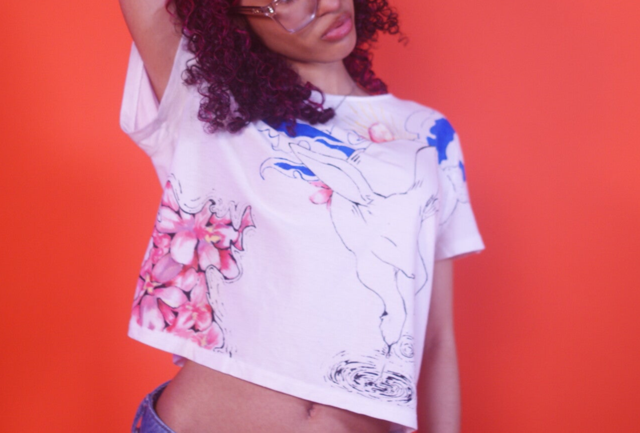 Cropped white T-shirt with a design of a rabbit, water drop, and cherry blossoms